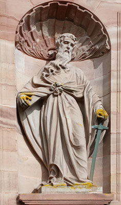 La façade est ornée des statues de Saint-Pierre et de Saint-Paul. Observez ici les coquilles Saint-Jacques placées à l'arrière de leur tête. Chaque statue possède un taux vibratoire assez élevé.